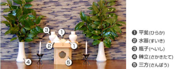 ①平瓮(ひらか・白い皿)には、お米・お塩を盛る。②水器(すいき)には、お水を入れる。③瓶子(へいし)には、お酒を入れる。④榊立(さかきたて)には、榊を立てる。⑤三方(さんぼう)または折敷(おしき)には、これらを載せます。また、燈明(とうみょう)は電灯式の燈籠型のものやローソクを一対灯します。